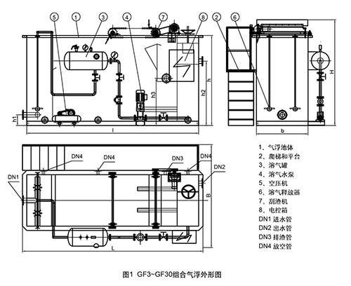 QF組合氣浮池由氣浮池體、溶氣系統(tǒng)、溶氣回流管路、溶氣水釋放裝置、刮渣裝置(根據(jù)用戶需要可以分別采用組合式、行車式和鏈板式)和電控柜等部件組成。氣浮分離技術(shù)是指空氣與水在一定的工作壓力下,使氣體大限度地融入水中,力求處于飽和狀態(tài),然后把形成的壓力溶氣水通過減壓釋放,產(chǎn)生大量的微細氣泡, 與水中的懸浮絮體充分接觸,使水中懸浮絮體粘附在微氣泡上,并隨氣泡一起浮到水面,形成浮渣并刮去浮渣,從而凈化水質(zhì)。